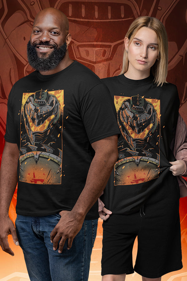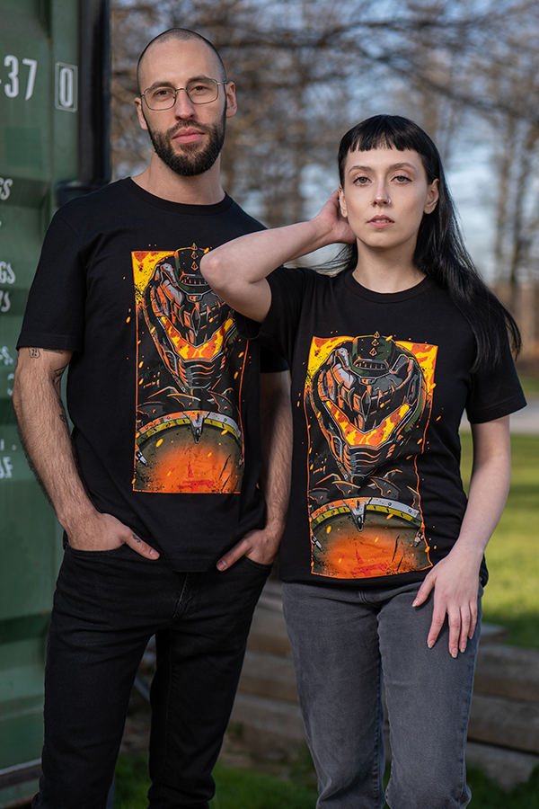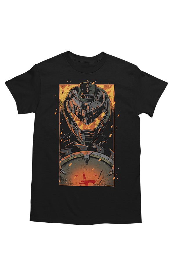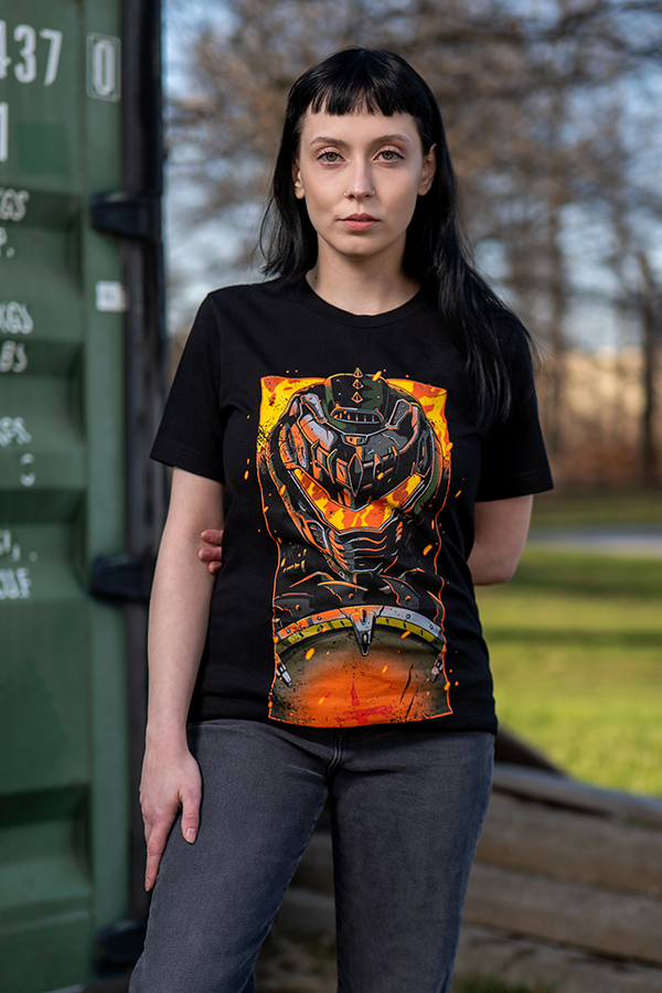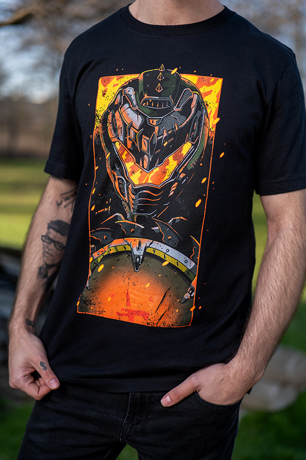This tee features a closeup of the DOOM Slayer and his medieval armament. Embers float around him as the battlefield burns bright orange. Eye-catching as it is, we set this artwork against a backdrop of black cotton fabric to make it really pop! Wear the Slayer’s fire and fury with your DOOM: The Dark Ages In Flames Tee!