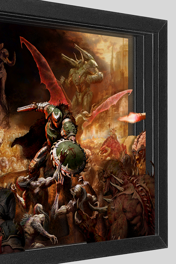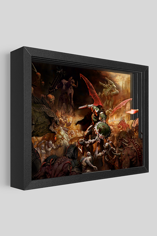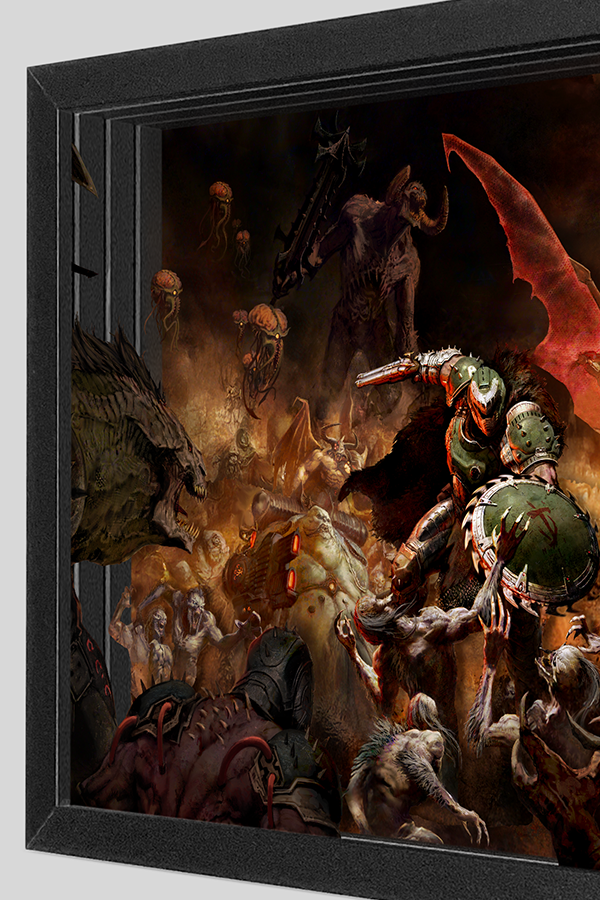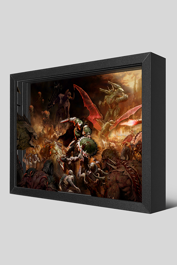 Dive into the depths of Hell! DOOM: The Dark Ages Shadowbox finds the DOOM Slayer in the thick of battle. He exacts righteous carnage upon a mass of demons, closing in on him from all sides.