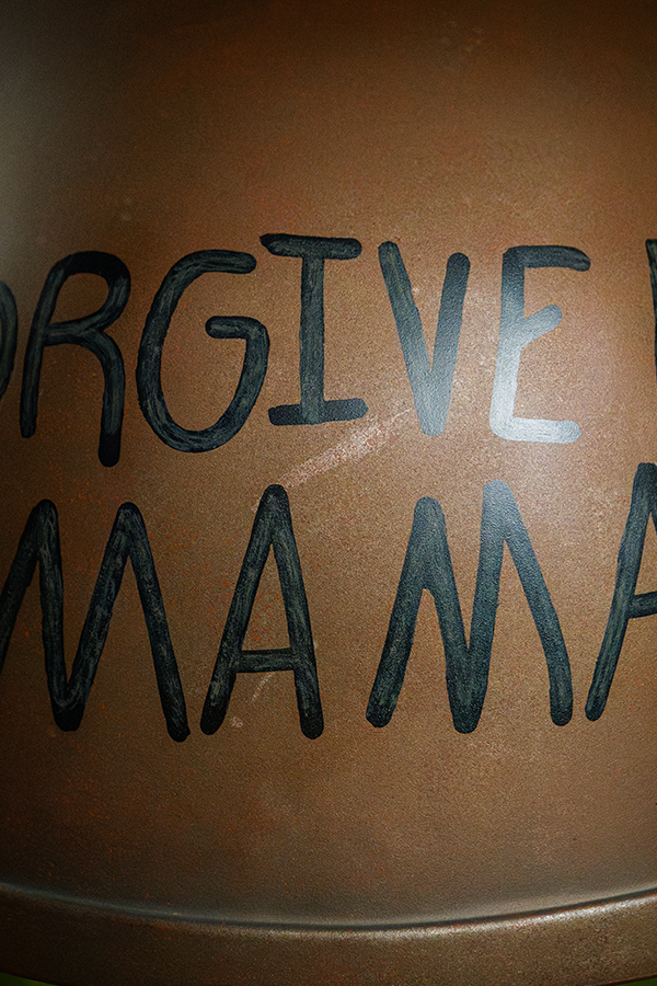 Green LED lights give the eyes a green glow. And written on the forehead are the words, “Forgive Me Mama”; a glimpse of a story now long forgotten.