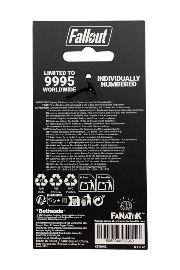 Quench your thirst for all things retro-futurista and grab your own piece of the wasteland! Based on the iconic in-world brand, this metal Nuka-Cola keyring measures 55 x 27mm, is limited to 9995 worldwide and individually numbered on the reverse.