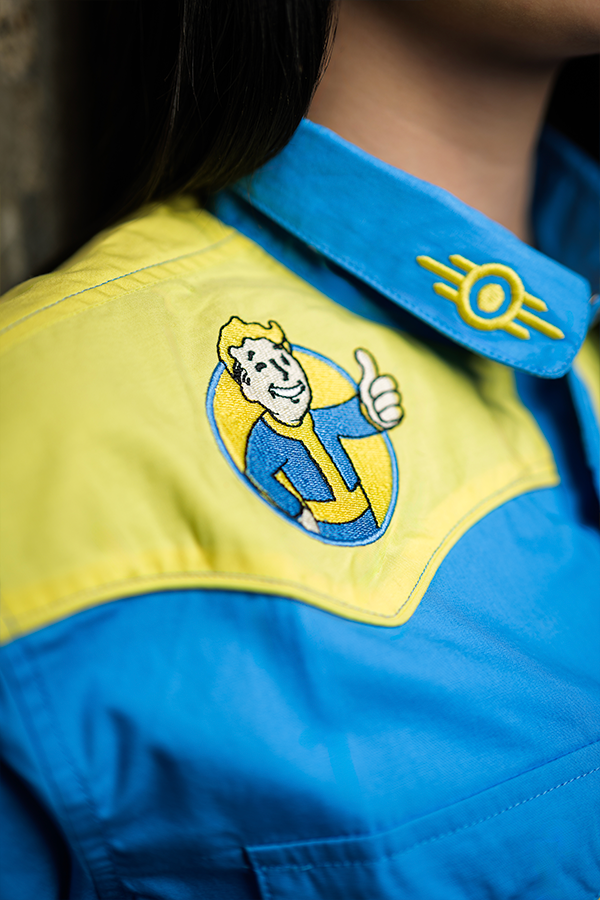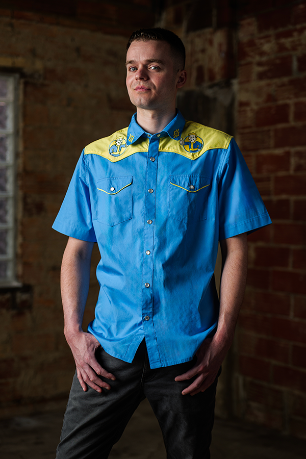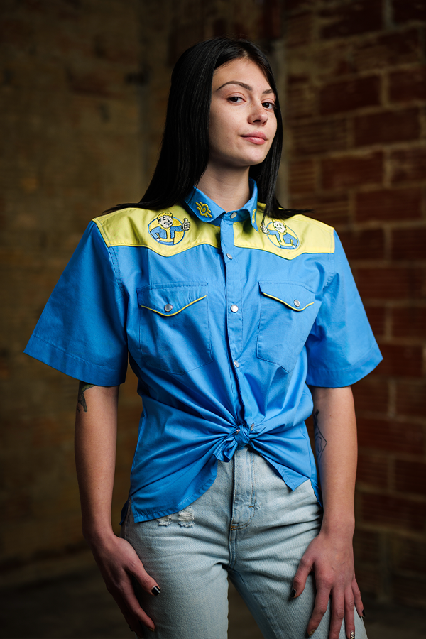 Welcome to the Wild Wastes, an arid world straddling the edge of civilization. It’s home to dirt, outlaws, and mutant cattle. In this brave new frontier, you’ll need the proper equipment to survive. And if you’re the type to wrangle, duel, and shoot your way in and out of trouble, you’ll feel right at home in your Fallout™ Vault-Tec Cowboy Button-Up Shirt.